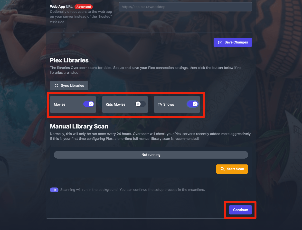 - Scroll down and flip the switch on the libraries you want to expose for requests and discovery. Click "Continue".