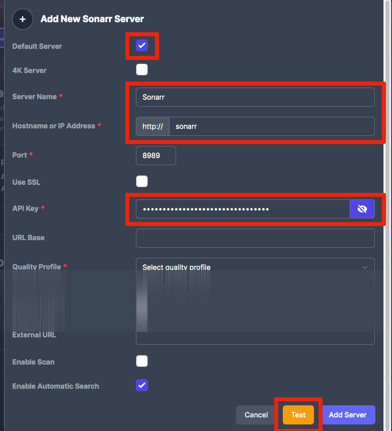 - Scroll down and click "Test" to connect to Sonarr and retrieve Quality Profiles, etc.