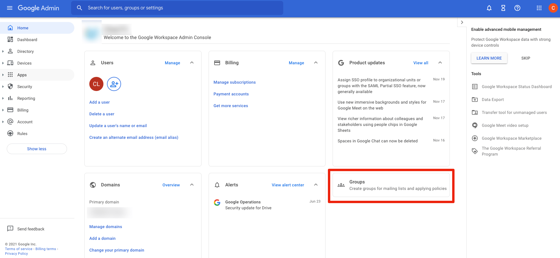- Open the Google Admin site: https://admin.google.com/ and login with your Google account. Click on the groups heading: