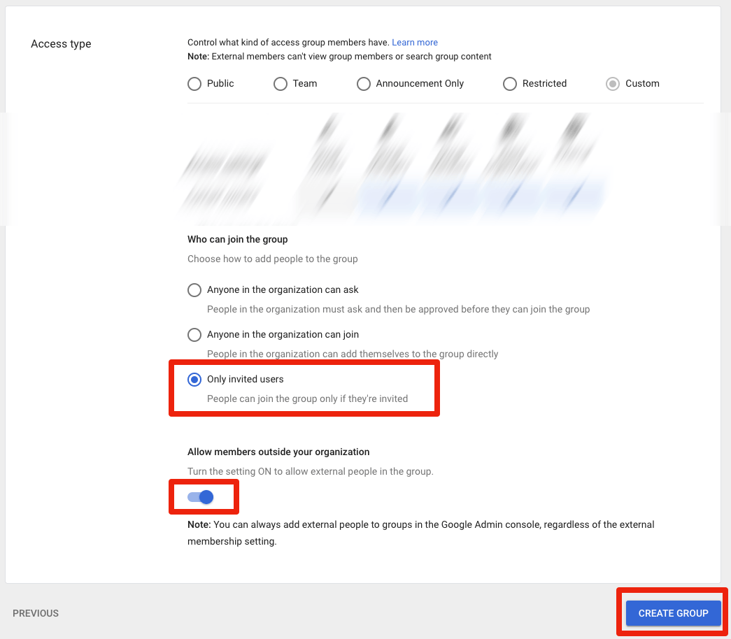 - Scroll down, change "Who can join" to "Only invited users", and toggle "Allow members outside your organization". Click "Create Group".