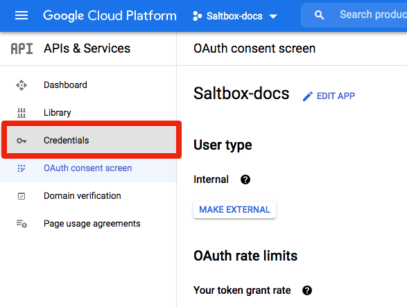 Now click "APIS and Services" then "Credentials" in the left column to go to the credentials dash: